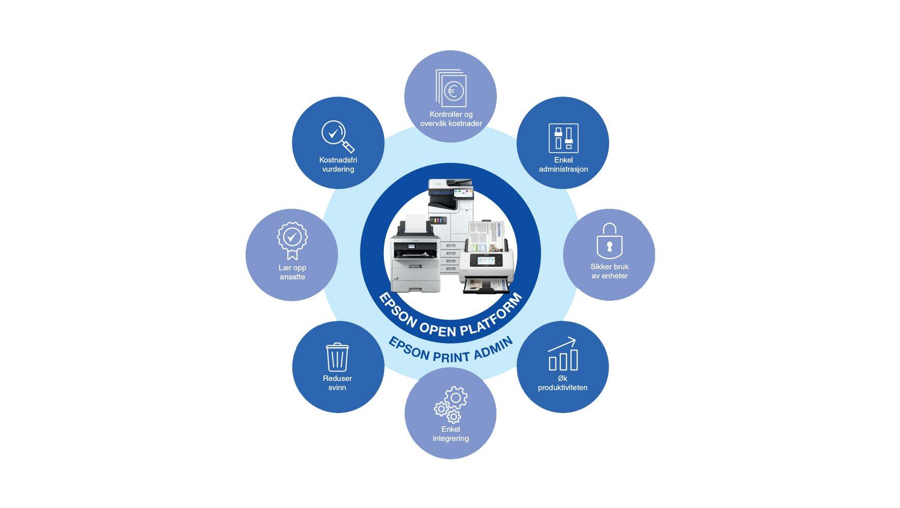 Epson Print Admin er en serverbasert programvareløsning som gir bedrifter sentralisert kontroll og sikkerhet over utskrift, skanning og kopiering.