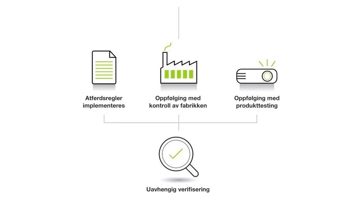 Uavhengig verifisering av overholdelse for produktet, fabrikken og merkevareeier er inkludert, både før og etter sertifisering.